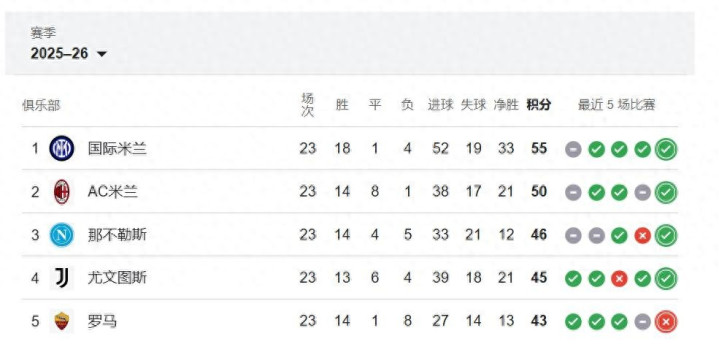 当前米兰与领头羊国米仍有 5 分差距,但正如此前所言,球队本轮的核心收获在于进一步拉开了与积分榜第五名罗马的距离(目前领先 7 分)。若以重返欧冠为赛季首要目标,这样的积分优势已赋予球队不小的容错空间。